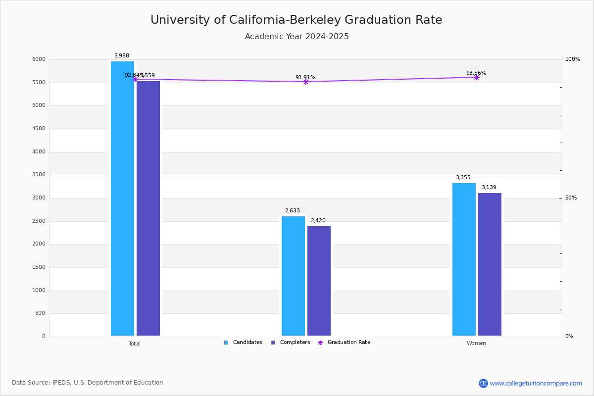 The graduation rate of American Indian or Alaska Native students is 63.64%, rate of Asian students is 95.28%, rate of Black (Non-Hispanic) students is 82.52%, rate of Hispanic students is 85.60%, rate of White students is 92.98%, rate of Native Hawaiian or Other Pacific Islander students is 100.00%, rate of Two or More Race students is 94.33%, and rate of Unknown students is 96.38% at University of California-Berkeley.